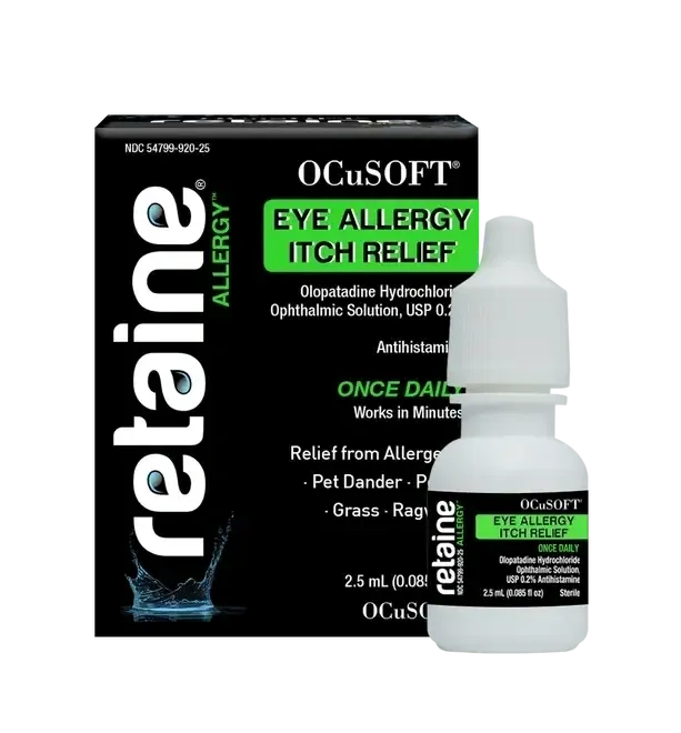 Fast-Acting Antihistamine Eye Drops for Long-Lasting ComfortRetaine® Allergy Eye Drops, formulated with Olopatadine Hydrochloride 0.2%, provide once-daily relief from itchy, irritated eyes caused by allergens such as pollen, ragweed, grass, pet dander, and dust. This original prescription-strength antihistamine eye drop works in minutes to deliver long-lasting comfort.