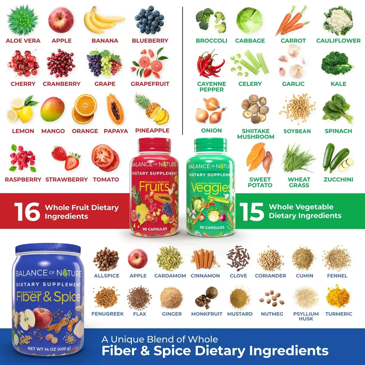 Ingredients from Fruits, Vegetables, Fibers, and Spices: Balance of Nature Whole Health System supplements have no binders, additives, or added fillers. The only thing in our supplements is whole food ingredients.